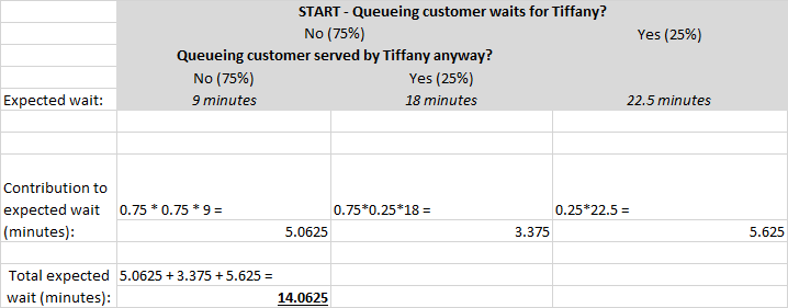 The expected waits are fairly straightforward. If the queueing customer doesn’t wait for Tiffany and isn’t served by her, then Tiffany will be the second, third, or fourth barber to finish. She can’t be the first to finish in this case, so she will take longer than 7.5 minutes on average. If the queuing customer doesn’t wait for her but is served by her, then she must have been the first barber to finish. If the first customer will wait for Tiffany, then we don’t know how soon she will finish, so we expect to wait an average length of time for her to finish (7.5 minutes) plus 15 minutes for the queueing customer.