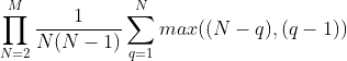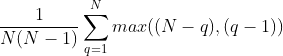 In the triangular section, you can see max((N–q),(q-1)) for the values of N in row two, and q in column C. The sum of those values, for a particular N, is in row 24, and N(N-1) is calculated in row 25. Dividing row 24 by row 25 gives the value of formula 4, and is on row 27 in decimal form, and on row 28 as a fraction. Lastly, multiplying values on line 27 together gives the values on line 30, equal to formula 5.