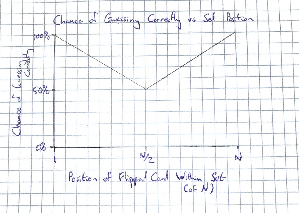 Regardless of how large the set of cards is, the closer your first flipped card is to the middle of the group, the less likely your guess is to be correct. The closer your first flipped card is to one of the extremes, the better your chances are of guessing correctly. If you have N cards in your set, your chances of guessing correctly after the first flip depend on the position of your flipped card within the set, like this: