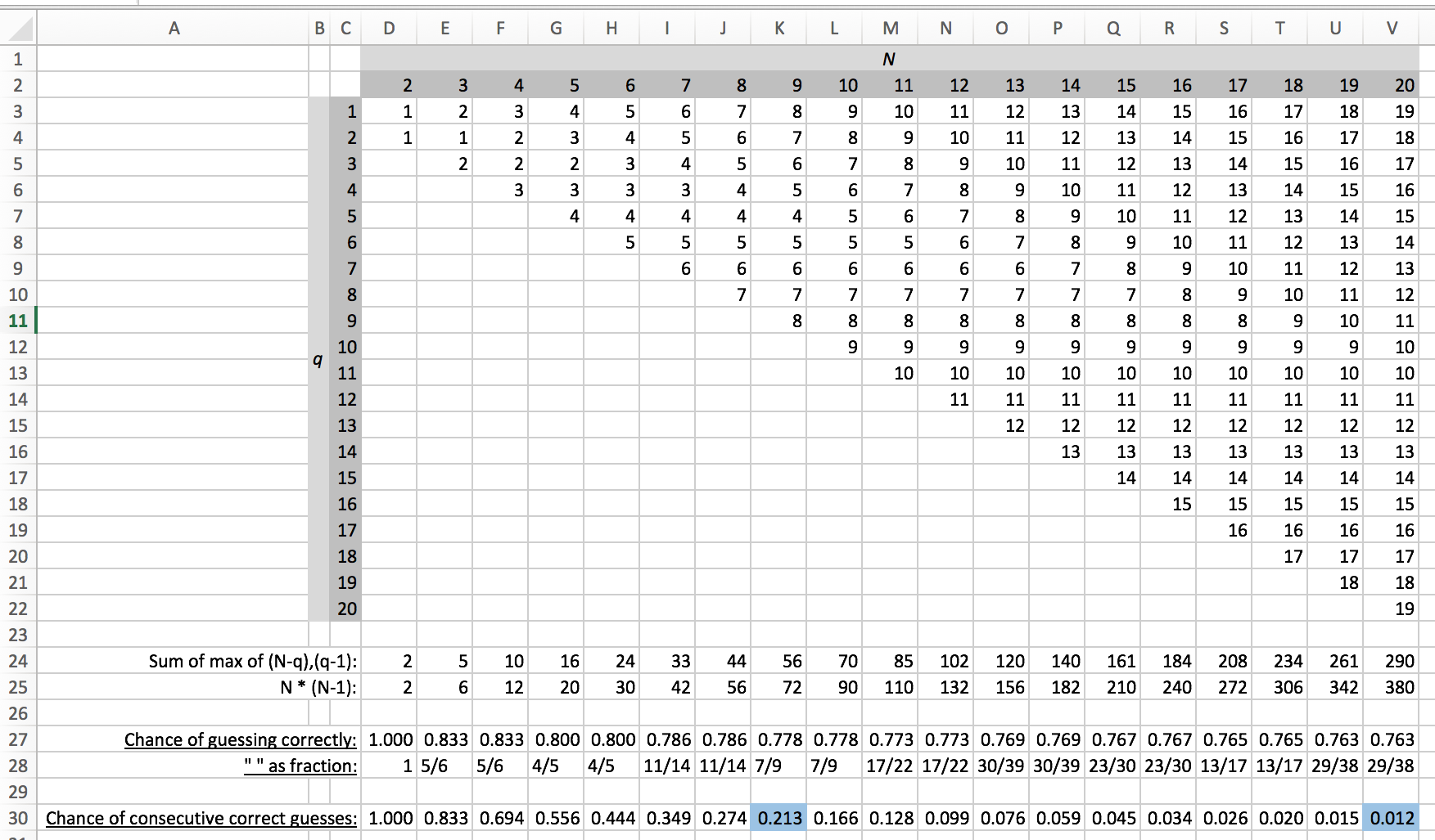 The denominator is easy to understand: N-1 is the total number of cards left after you flip the first card. The max() function is a little more tricky. Truthfully I don’t know if that’s the normal way to write this, but that’s what I would do in Excel, so that’s what I’ve done here. N-q is the number of cards greater than the qth card, and q-1 is the number of cards less than the qth card. Which of those is the larger determines whether you would guess that the next card is higher or lower.