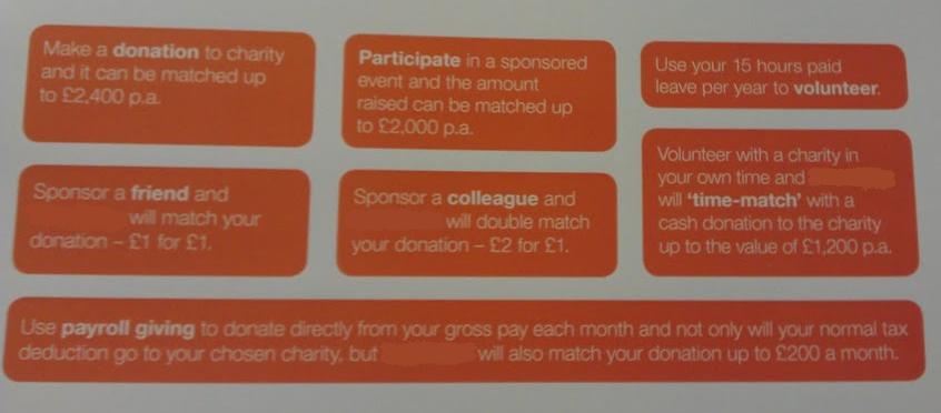 “Sponsor a colleague and [we] will double match your donation – £2 for £1”; “Volunteer with a charity in your own time and [we] will ‘time-match‘ with a cash donation to the charity up to the value of £1, 200 p.a.”